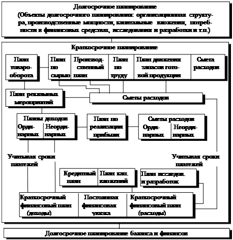 Таким образом, назначение планирования как функции управления состоит в стремлении заблаговременно учесть по возможности все внутренние и внешние факторы, обеспечивающие благоприятные условия для нормального функционирования и развития предприятий, входящих в фирму. Оно предусматривает разработку комплекса мероприятий, определяющих последовательность достижения конкретных целей с учетом возможностей наиболее эффективного использования ресурсов каждым производственным подразделением и всей фирмой. Поэтому планирование призвано обеспечить взаимоувязку между отдельными структурными подразделениями фирмы, включающими всю технологическую цепочку: научные исследования и разработки, производство и сбыт. Эта деятельность опирается на выявление и прогнозирование потребительского спроса, анализ и оценку имеющихся ресурсов и перспектив развития хозяйственной конъюнктуры. Отсюда вытекает необходимость увязки планирования с маркетингом и контролем с целью постоянной корректировки показателей производства и сбыта вслед за изменениями спроса на рынке.