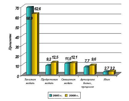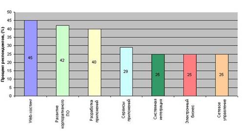 По данным источника InfoWorld Ofsourcing Study наиболее востребованными услугами IT-аусорсинга на мировом рынке в 2008 г. являются web-хостинг, развитие корпоративного программного обеспечения и разработка приложений (рисунок 1.1) [1].