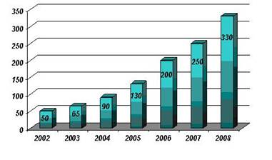 Но на данном этапе фактически размеры индустрии экспортно-ориентированного программирования в Беларуси соответствуют уровню развития отрасли Индии в 1988 г. и России – в 1999 г. Однако белорусский сектор оффшорного IT-бизнеса демонстрирует высокие темпы роста. По данным агентства Market-Visio Consulting/Gartner, объем экспорта IT-услуг в 2006 г. составил порядка 200 млн. долл. США, а в 2007 г., по предварительным оценкам, увеличился на 25% до 250 млн. долл. США. В 2008 г. этот суммарный показатель эффективности работы белорусских программистов достиг диапазона 300–350 млн. долл. США (рисунок 1.2).