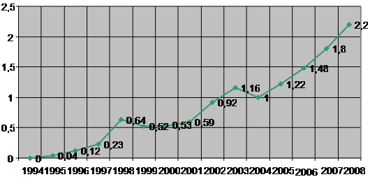 Таблица 1.1 – Экспорт компьютерных и информационных услуг в 1994–2008 гг., млн. долл. США