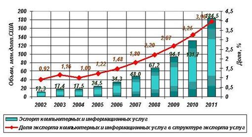Начиная с 1994 г. наблюдается тенденция роста экспорта компьютерных и информационных услуг и их доля в экспорте услуг (таблица 1.1, рисунок 1.3).