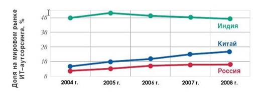 По оценкам PMR, в 2008 г. рынок IT-аутсорсинга в Центральной и Восточной Европе достиг почти трех млрд., что примерно на 25% выше аналогичного показателя 2007 г. Почти 40% всех доходов здесь приходятся на Россию; далее следуют Украина и Польша. Как прогнозируют польские исследователи, на протяжении следующих двух лет сегмент IT-аутсорсинга в регионе продолжит расти в денежном выражении, но вот ежегодные темпы роста снизятся. Тем не менее, среднегодовые темпы роста этого рынка – 20% – почти вдвое выше, чем по всему IT-рынку в целом.