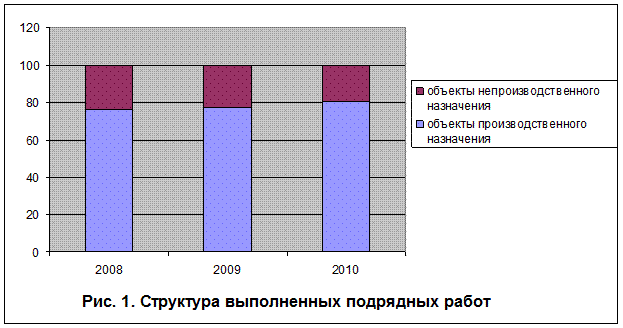 Проводя анализ, производственные результаты деятельности строительной организации и подводя итоги результатов, выявляется, что наибольшая доля объёма выполненных подрядных работ приходится на объекты производственного назначения – около ¾. За исследуемый период эта доля повысилась на 4,2%.