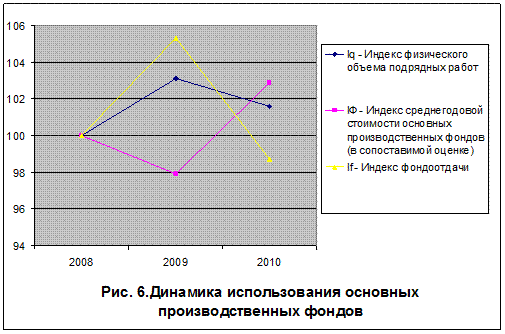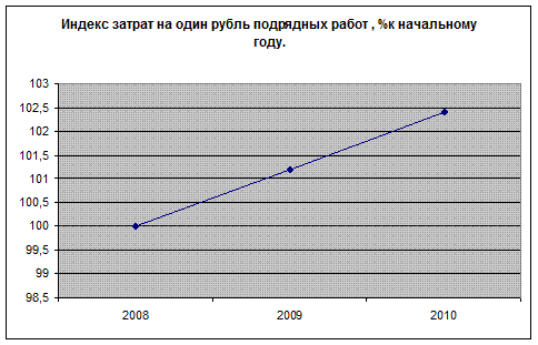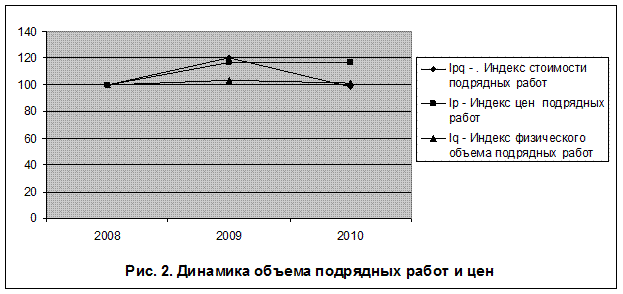 Динамика стоимостного и реального объема выполненных подрядных работ за исследуемый период, а также оценка влияния изменения цен и физического объема работ на рост их стоимости является одной из главных задач производственного анализа. В данной работе стоимостной и физический объем подрядных работ. В период 2008-2009 гг. видно увеличение всех показателей, так как повысились цены физического объема работ. А в период 2009-2010 гг. видно увеличение всех показателей, так как увеличились цены физического объема работ. Фактическая стоимость выполненных работ за период 2008-2010 гг. увеличилась на 30,7%. Увеличение стоимости подрядных работ в большей степени связано с ценовым фактором.