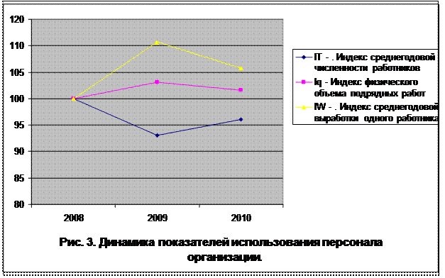 Наблюдаем постепенное снижение среднегодовой численности работников в период 2008-2009 гг.. что составляет 13% . Затем с 2009 по 2010 рост численности работников увеличился на 5%. Таким образом, рост физического объёма подрядных работ на 1,7% за рассматриваемый период обусловлен повышением производительности труда работников.