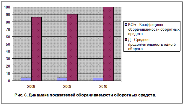 За период с 2008 – 2009 гг. коэффициент оборачиваемости упал на 0,2. А в период с 2009 по 2010 годы этот коэффициент снизился на 0,2.Таким образом, возрастает средняя продолжительность одного оборота повысилась на 14 дней за период 2008-2010 гг.