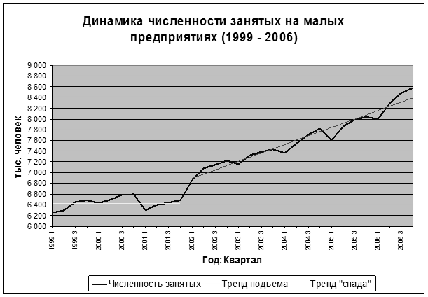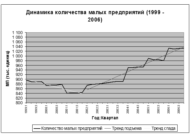 Для наглядного примера перейдем к графику 1 динамики малых предприятий за 1999-2006 г.