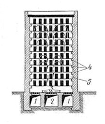 Камерная сушилка: 1 — подводящие каналы, 2 — отводящий канал, 3 — рельсы, 4 — выступы для укладки рамок с сырцом, 5—камера