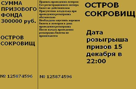 Данную информацию целесообразно расположить на обратной стороне билета мелким шрифтом. Крупным шрифтом на лицевой стороне билета будет указан размер призового фонда и название лотереи, соответствующее названию игорного заведения «Остров Сокровищ».