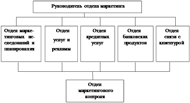 Я работаю в ОАО. В нашем банке существует маркетинговая служба, состоящая из отдела связи с клиентурой, отдела услуг и рекламы , отдела маркетинговых исследований и планирования, отдела банковских продуктов, отдела маркетингового контроля, которые решают следующие задачи: