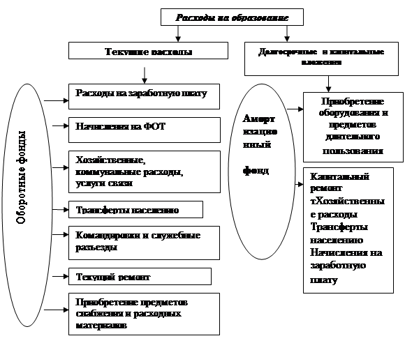 Из вышесказанного можно сделать вывод, расходы на образование подразделяются на три основные группы: текущие расходы, на оборудование и капитальный ремонт, капитальные вложения. К текущим расходам относятся: заработная плата, начисления на заработную плату, стипендии, расходы на питание, приобретение мягкого инвентаря и прочие расходы. Эта группа расходов является самой большой. Наибольший удельный вес в ней занимает заработная плата. В целом же структурные различия в затратах связаны с особенностями деятельности отдельных учреждений образования, видами материального обеспечения учащихся и студентов.