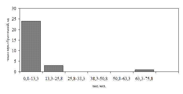 Рис. 4 – Гистограмма распределение городов и районов Амурской области по численности работников, занятых на предприятиях и в организациях