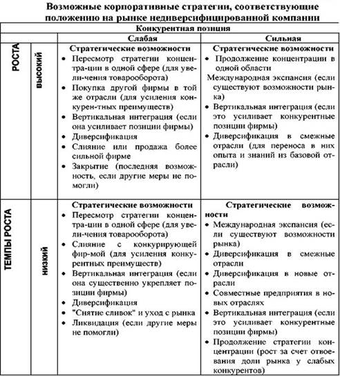 Компании со слабой конкурентной позицией на относительно медленно растущем рынке должны обратить внимание на следующие возможности: