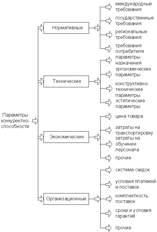 - полезностью (качество, эффект от использования и т.п.); - определяющими затратами потребителя при удовлетворении его потребностей посредством данного изделия (затраты на приобретение, использование, техническое обслуживание, ремонт, утилизацию и т.п.); - конкурентоспособностью предложения (способ продвижения продукции на рынок, условия поставки и платежа, каналы сбыта, сервисное обслуживание и т.д.).