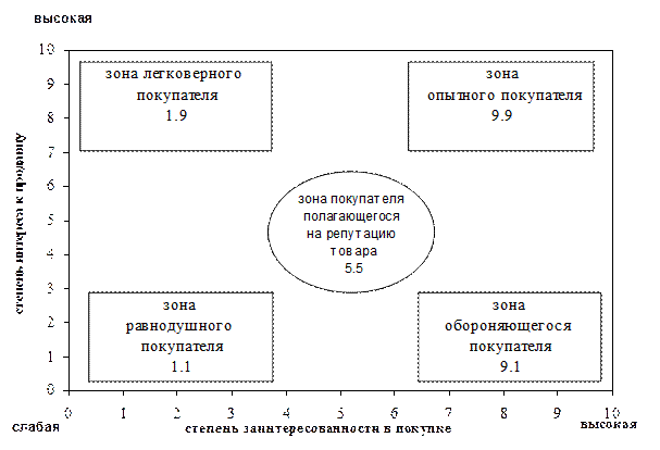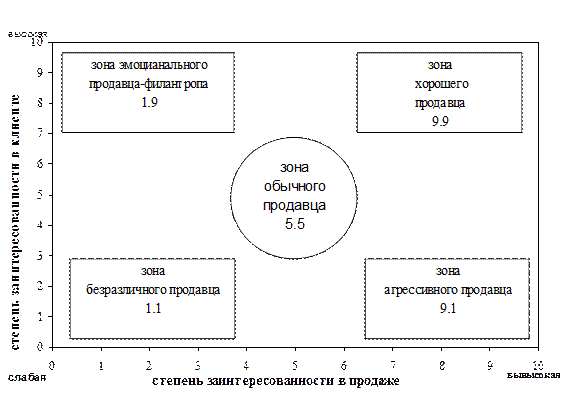 Любого продавца можно точно охарактеризовать по степени его заинтересованности в продаже и степени его внимания к клиенту. Если отложить первый показатель на оси абцисс, а второй - на оси ординат, получится типовая характеристика того или иного продавца (рис. 2.)