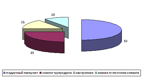 Таким образом, на основе полученных результатов можно сделать определенный вывод. Сотрудники туристической фирмы ООО «S7 Tour» теоретически понимают, что основой успеха в продажи туристического продукта являются знания области психологии. То есть для успешных продаж в области туризма, знание профессии необходимо, но это не залог успеха, наиболее положительного результата можно добиться, если расположить клиента к себе, применив психологические приемы, которые являются наиболее успешными предпосылками продажи турпродукта