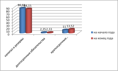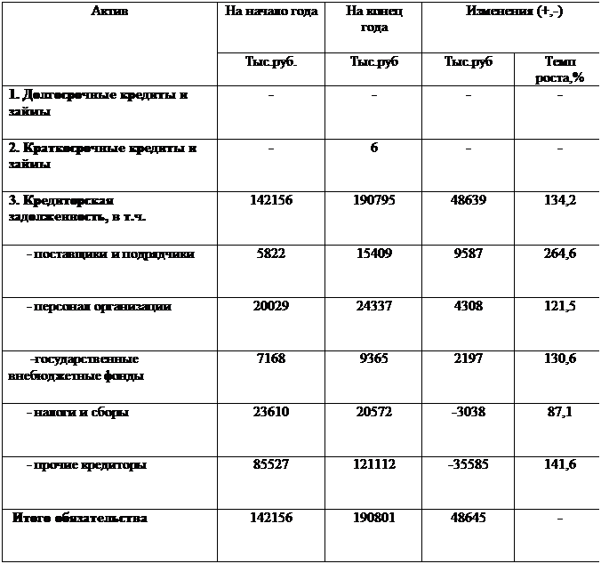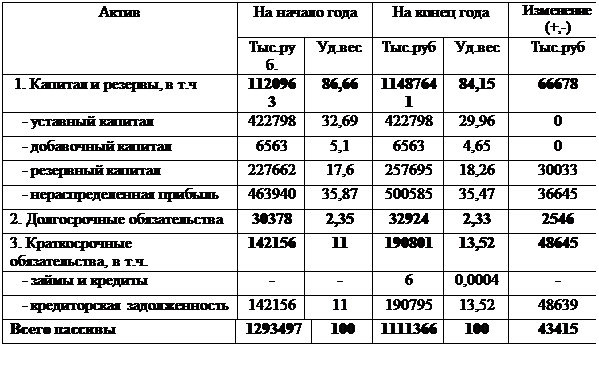 Пассивная часть баланса характеризуется значительным преобладанием удельного веса краткосрочных обязательств. В целом прослеживается небольшое увеличение капитала и резервов, увеличение краткосрочных обязательств. Значение кредиторской задолженности снизилось. С одной стороны, это положительный момент, так как предприятие для выполнения своих работ пользуется заемными средствами, увеличивая возможности собственного производства и снижая необходимость дополнительных собственных капиталовложений. Но также это свидетельствует о том, что предприятие сильно зависит от своих покупателей.