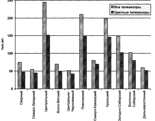 Отметим, что регионы РФ различаются динамикой объемов продаж телевизоров. Наиболее значительно объемы продаж телевизоров за период 1995-1997 г. упали в Центральночерноземном регионе (в 3,15 раза), в Восточно-Сибирском регионе (в 2,4 раза). Наибольшая доля проданных в 1997 г. телевизоров приходилась на Центральный регион - 18,3% общего объема продаж и Поволжский регион -16% (Приложение 1).