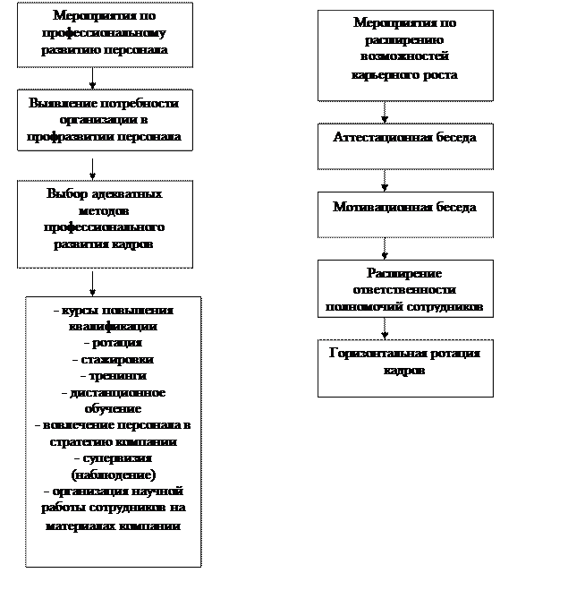 Мероприятия по профессиональному развитию кадров предполагают выявление потребности организации в развитии персонала и выбор адекватных методов профессионального обучения: курсы повышения квалификации, ротация, стажировки, тренинги, дистанционное обучение, вовлечение персонала в стратегию компании, организация научной работы сотрудников на материалах компании.