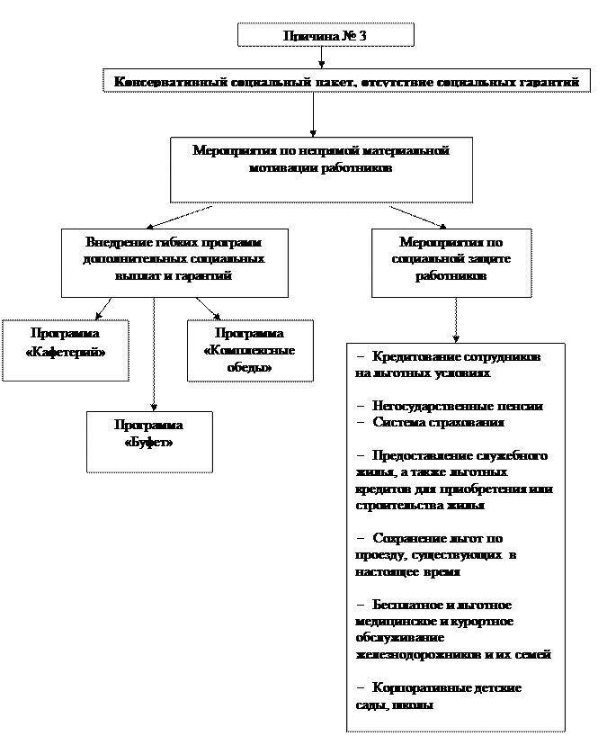 Мероприятия по непрямой материальной мотивации предусматривают внедрение гибких программ дополнительных социальных выплат и гарантий («Кафетерий», «Буфет», «Комплексные обеды») и мероприятия по социальной защите работников: кредитование сотрудников на льготных условиях, негосударственные пенсии, система страхования, бесплатное и льготное медицинское и курортное обслуживание железнодорожников и их семей.