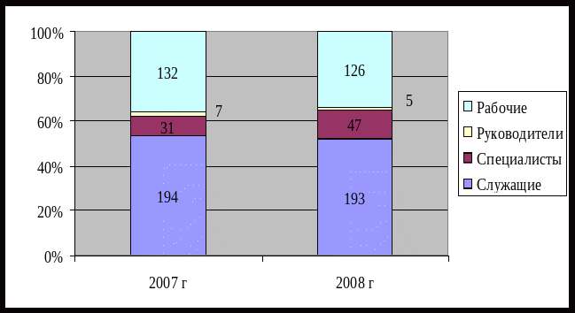 Таблица 5 Категории работающих в ООО «СДН ТрансАвто» за период 2007-2008 гг. | Показатель | На 01.01.2008 г. | На 01.01.2009 г. | Отклонение | | +,– | % | | Служащие | 193 | 194 | +1 | +0,5 | | Специалисты | 47 | 31 | -9 | -19,1 | | Руководители | 5 | 7 | +2 | +28,5 | | Рабочие | 126 | 132 | +6 | +4,7 |