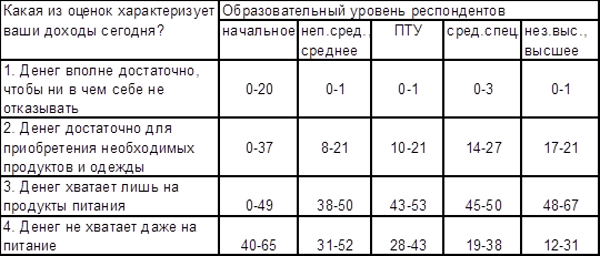 Потеря работы, скатывание по социальной лестнице напрямую связаны с ухудшением материального положения. Попробуем оценить его уровень у безработных с различным образованием (см.таблицу 2).