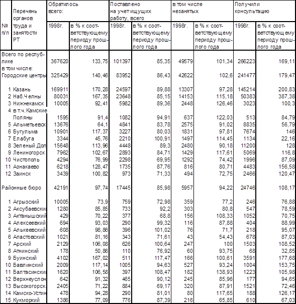 Обращаемость граждан в органы труда и занятости Республики Татарстан за январь-ноябрь 1998 года представлена в таблице 1.