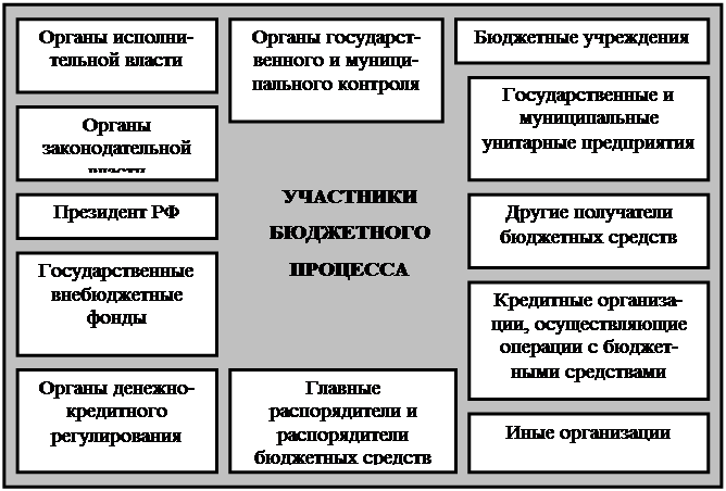 Участниками бюджетного процесса также являются бюджетные учреждения, государственные и муниципальные унитарные предприятия, другие получатели бюджетных средств, кредитные организации, осуществляющие отдельные операции со средствами бюджетов.