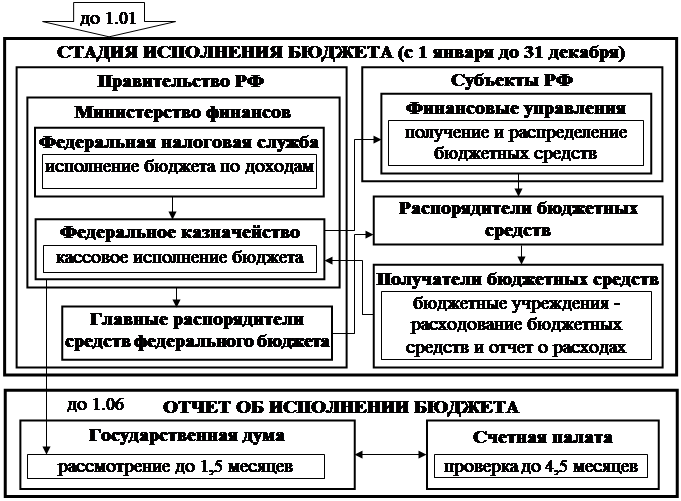 Основы бюджетного процесса определила Конституция РФ, уточнил и развил данные нормы Бюджетный кодекс РФ. Порядок бюджетного процесса, определяемый Бюджетным кодексом РФ, является единым для всех уровней бюджетной системы. Однако субъекты Федерации и органы местного самоуправления конкретизируют порядок бюджетного процесса на своей территории. Деятельность государства от начала составления государственного бюджета до утверждения отчета о его исполнении длится около трех с половиной лет, и этот срок называется бюджетным циклом.