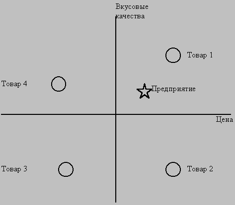 Далее, выставьте по осям вышеуказанной диаграммы результаты опросов групп Потребителей, отражающие их представления об идеале данного вида продукции, в виде группы точек на диаграмме. Данные группы, в принципе, могут рассматриваться как сегменты рынка. Поэтому возможно, что в результате анализа этой диаграммы может возникнуть потребность в разработке продукции с несколько видоизмененными характеристиками для конкретных групп.
