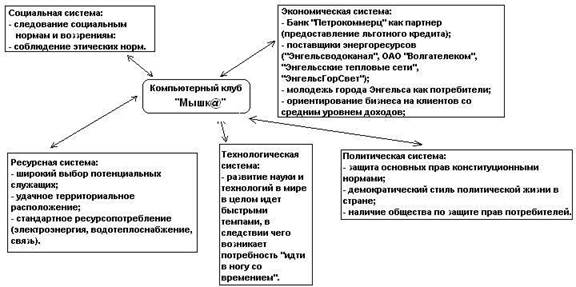 Связи компьютерного клуба «Мышк@» будут отражаться через взаимодействия с клиентами, конкурентами, партнерами, государственными структурами, органами местной власти, налоговой инспекцией, с организациями, обеспечивающими энергоресурсами (электроэнергией, тепловодоснабжением, связью), контролирующими структурами.