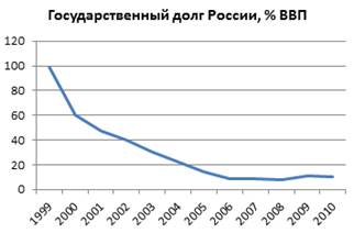Динамика государственного долга России в 1999—2010 годах, в % к ВВП (рис.).