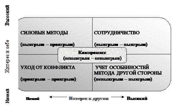 Но при этом таким же эффективным способом разрешения конфликтов является сотрудничество. Одним из существенных плюсов данного метода является то, что его применение возможно как при вертикальных конфликтах («вертикальные переговоры»: начальник – группа работников; трудовой коллектив – администрация предприятия), так и при горизонтальных («горизонтальные переговоры»: начальник отдела – начальник отдела; группа работников – группа работников).
