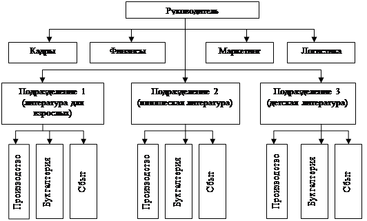 1) В продуктовой структуре управления (рис.5) в качестве основного структурного элемента выделяется полностью автономное в хозяйственном отношении производственное отделение, выпускающее определенный вид продукции. На эти отделения возлагается вся ответственность за разработку, производство и сбыт продукции. Руководство отделением осуществляет один руководитель, который несет полную ответственность за производимый продукт.