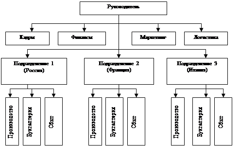 3) Региональная структура управления (рис. 7) создается по территориальному признаку, т.е. месту расположения ее подразделений. Региональная структура используется, если деятельность организации охватывает большие географические территории. Региональная структура облегчает решение проблем, связанных с местным законодательством, спецификой местных обычаев и нужд потребителей.