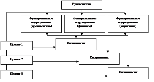 2. Матричные организационные структуры управления (рис.9) образуются путем наложения проектной на постоянно действующую для организации функциональную структуру управления.