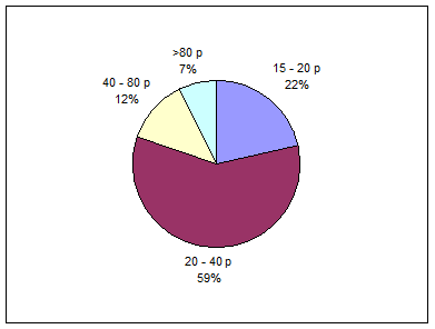 59% респондентов готовы отдать за пол-литра сока сумму не более сорока, но не менее 20 рулей.