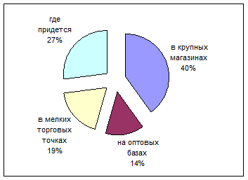 40% опрошенных отдают предпочтение в выборе сока крупным магазинам. Этот выбор обусловлен большей степенью доверия им, нежели мелким торговым точкам.