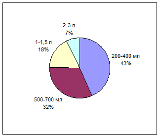 Одиннадцатый вопрос дает информацию о том, что 43% покупателей сока предпочитают маленькую тару, 32% 0,5-0,7 литра, и лишь 25% берут сок в тарах 1л. и более.