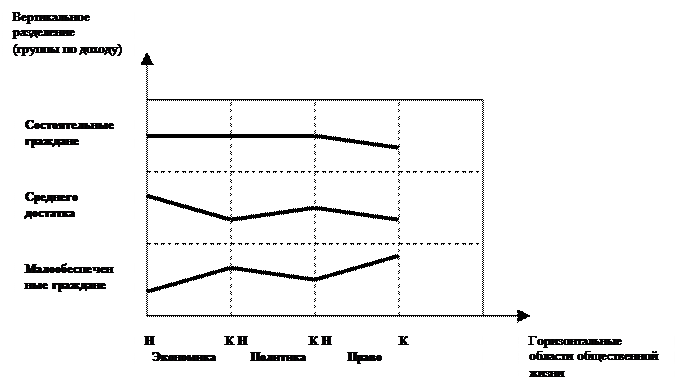 • многоуровневое вертикальное разделение социальных групп по доходу, интересам, образованию;