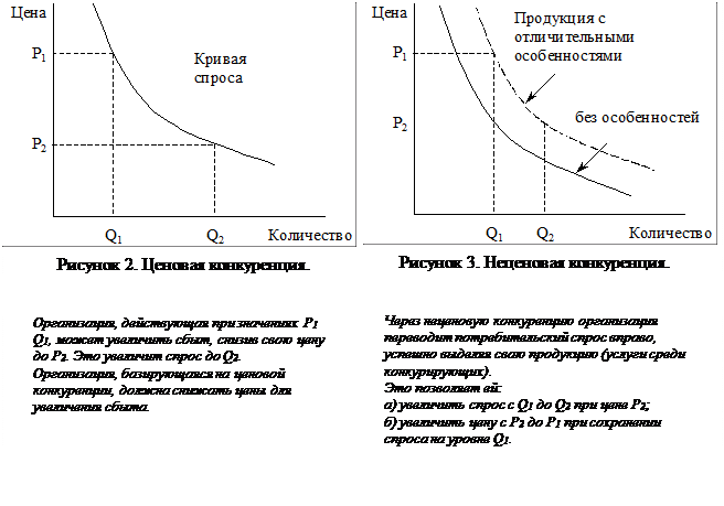 Через ценовую конкуренцию продавцы влияют на спрос главным образом посредством изменения в цене. Неценовая конкуренция минимизирует цену как фактор потребительского спроса, выделяя товары или услуги посредством продвижения, упаковки, поставки, сервиса, доступности. Чем уникальнее предложение продукции с точки зрения потребителей, тем больше свободы в установлении цен выше, чем у конкурирующих товаров (рис. 2 и 3).