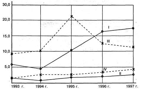 Рис.1.1. Динамика прибытий иностранных граждан в Россию и выездов граждан из России в 1993—1997гг.