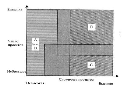 В принципе при реализации управления проектом в децентрализованных организациях имеют место большие проблемы. Здесь, в частности, при большой области контроля (в английской версии «норма управляемости») выступает проблема делегирования проектных задач сотрудникам, занятым в проекте (рис. 20 Приложение 9).