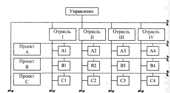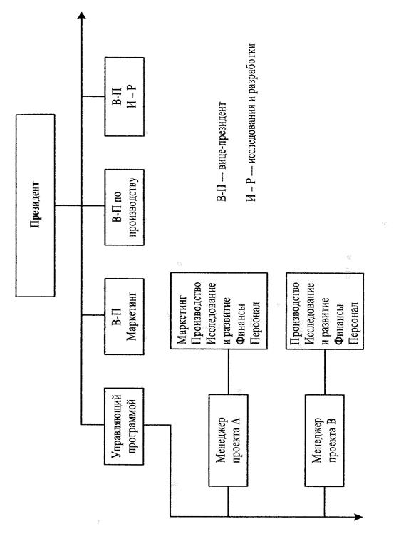 - матричная структура. Промежуточная форма, объединяющая преимущества проектной и функциональной структур управления. Могут быть выделены три разновидности матричной структуры организации: слабая матрица, когда координатор проекта отвечает за координацию задач по проекту, но имеет ограниченную власть над ресурсами; сбалансированная матрица, когда менеджер проекта координирует все работы и разделяет ответственность за достижение