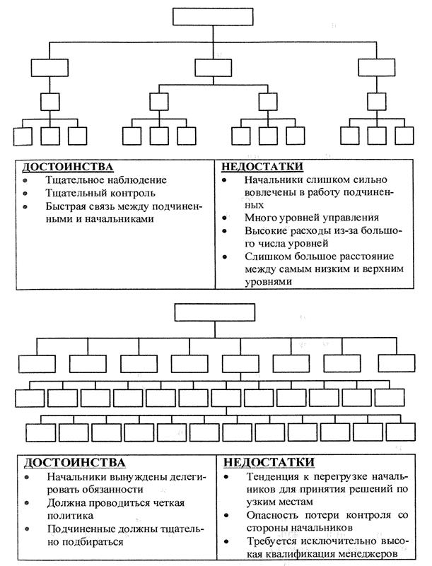 Рис. 20. Организационные структуры с узкими и широкими областями контроля