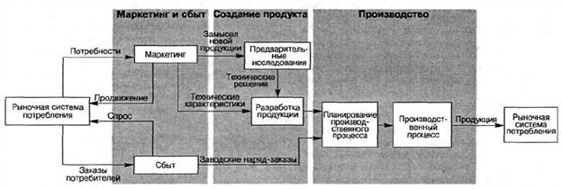 Как видно из приведенного ниже рисунка, в процессе проектирования продукции задействованы три основные функции: маркетинг, разработка продукции и ее производство. Маркетинг отвечает за предложение идей относительно новых видов продукции и за сбор информации о технических характеристиках, имеющихся на рынке товаров. Разработчики продукции несут ответственность за обоснованность технической концепции продукции и совершенство окончательного проекта. Производство отвечает за выбор или модификацию технологических процессов, предназначаемых для выпуска выбранной или разработанной компанией новой продукции.