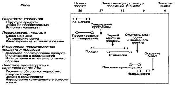 Разработка новых ВИДОВ продукции сулит компании невероятные потенциальные возможности, но реализовать эти возможности — задача очень сложная. Процесс разработки новой продукции представляет собой сложнейший комплекс различных видов деятельности, теснейшим образом связанных с большинством других бизнес-функций. На рис.2 изображены фазы типичного проекта по разработке новой продукции.