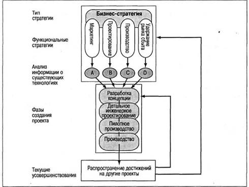 Примечание. При определении того, какие потенциальные технологические возможности наиболее многообещающие для развития бизнеса, компания Hewlett-Packard опирается прежде всего на свои функциональные и бизнес-стратегии. Целесообразность внедрения новых технологий определяется упреждающими проектами еще до применения этих технологий в конкретных проектах создания новой продукции. (Обратите внимание, что при разработке продукции HP использует типичный четырехфазовый процесс, за которым следуют мероприятия, направленные на распространение и закрепление достижений в других проектах.)