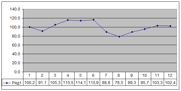 Индексы сезонности показывают, что средний объем реализации товара в январе больше среднего объема реализации за весь период на 2 % (100,2-100).