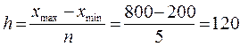 Сформируем интервалы группировки – (200 – 320); (320 – 440); (440 – 560); (560 – 680); (680 – 800). Для построения самой группировки построим рабочую таблицу 2.